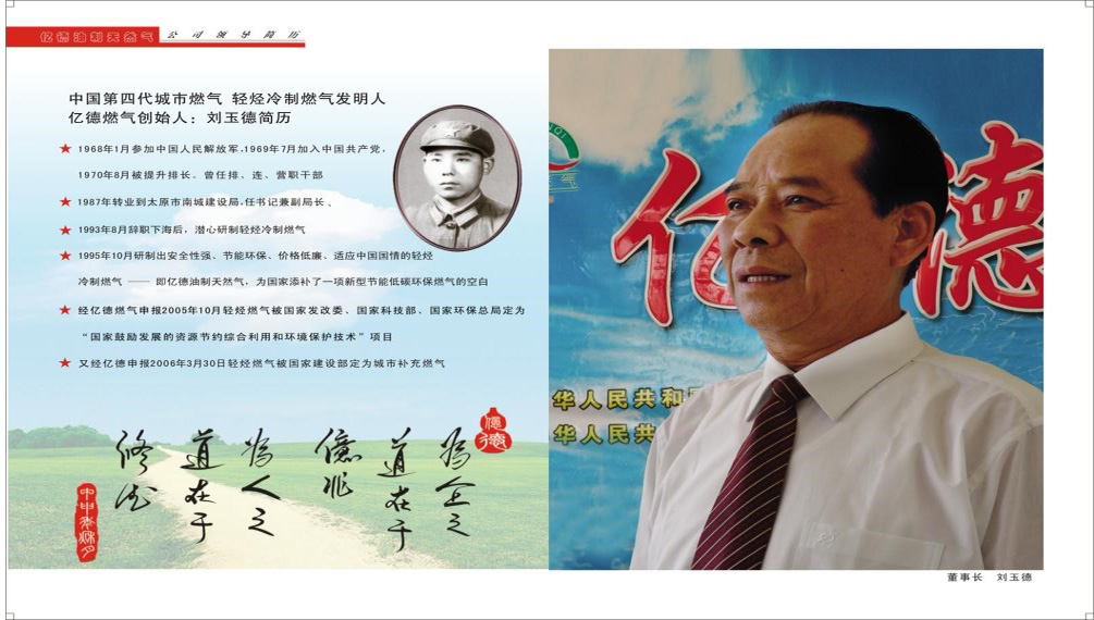 劉玉德簡介:1968年1月參軍,1969年7月入黨,1970年8月提干,1987年轉業,1990年任太原市南城區城建局副局長,1993年申請辭職下海,開發輕烴“常溫低壓”冷制燃氣;2005年被我國納入《鼓勵發展的資源節約綜合利用和環境保護技術》和《城市燃氣》。